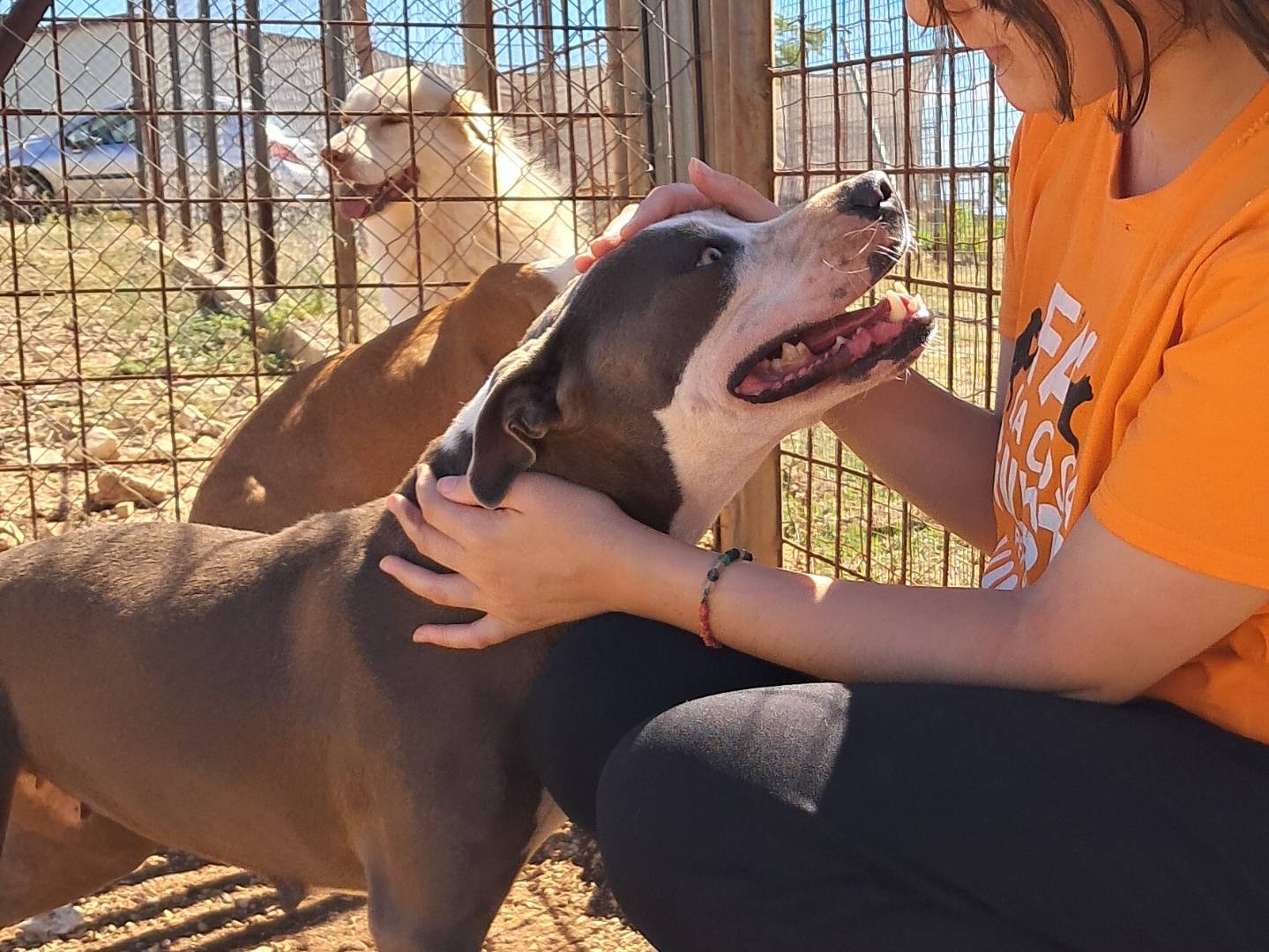 Questa dolcissima pitbull è stata abbandonata in una campagna sperduta dove ha partorito 7 cucciolini sotto un trattore. Salvata e curata, oggi è una cagnolina perfettamente sana e dal carattere splendido. Ama il contatto umano più di ogni altra cosa ed è estremamente socievole con persone e bambini.