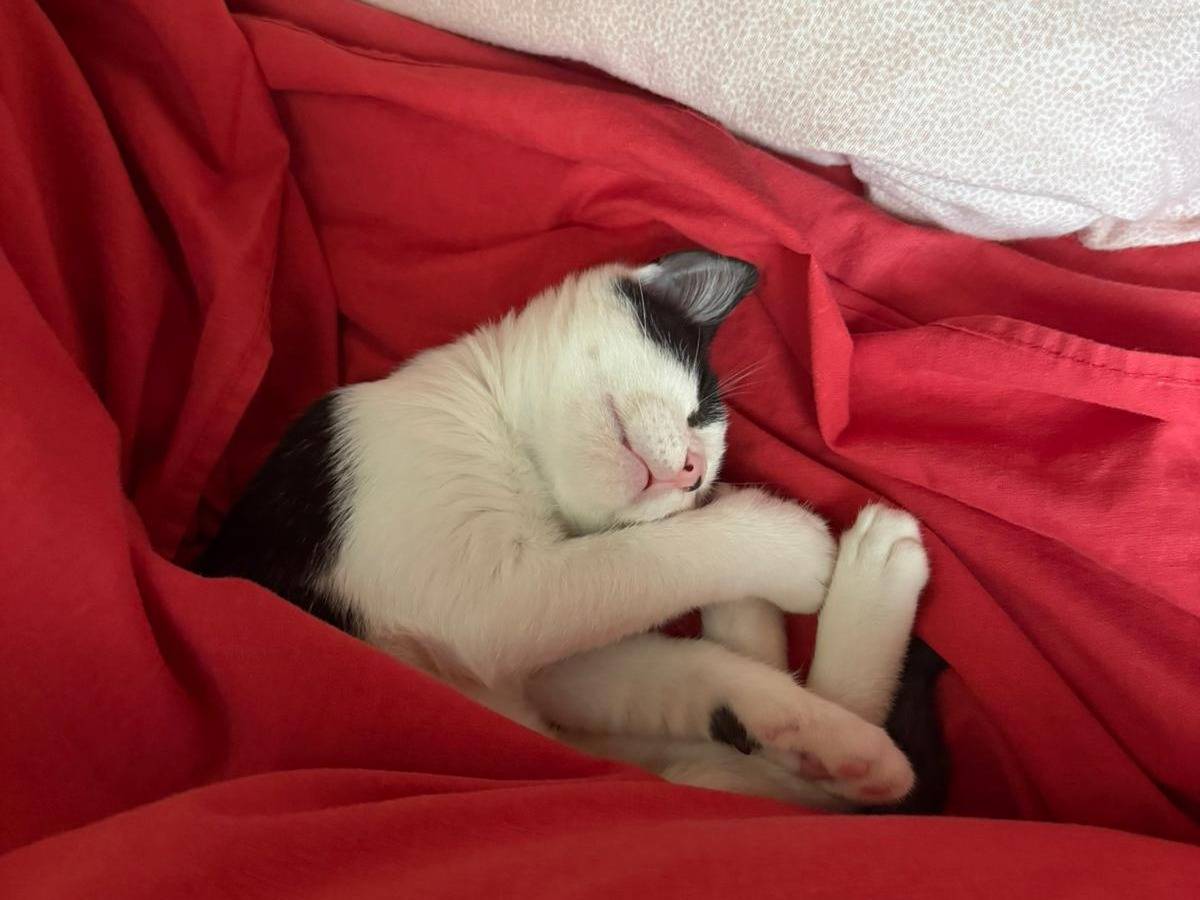 Merlino è stato salvato per un pelo dalla rinotracheite. Ora è un gattino super affettuoso e giocherellone. È sano e pronto ad essere adottato.