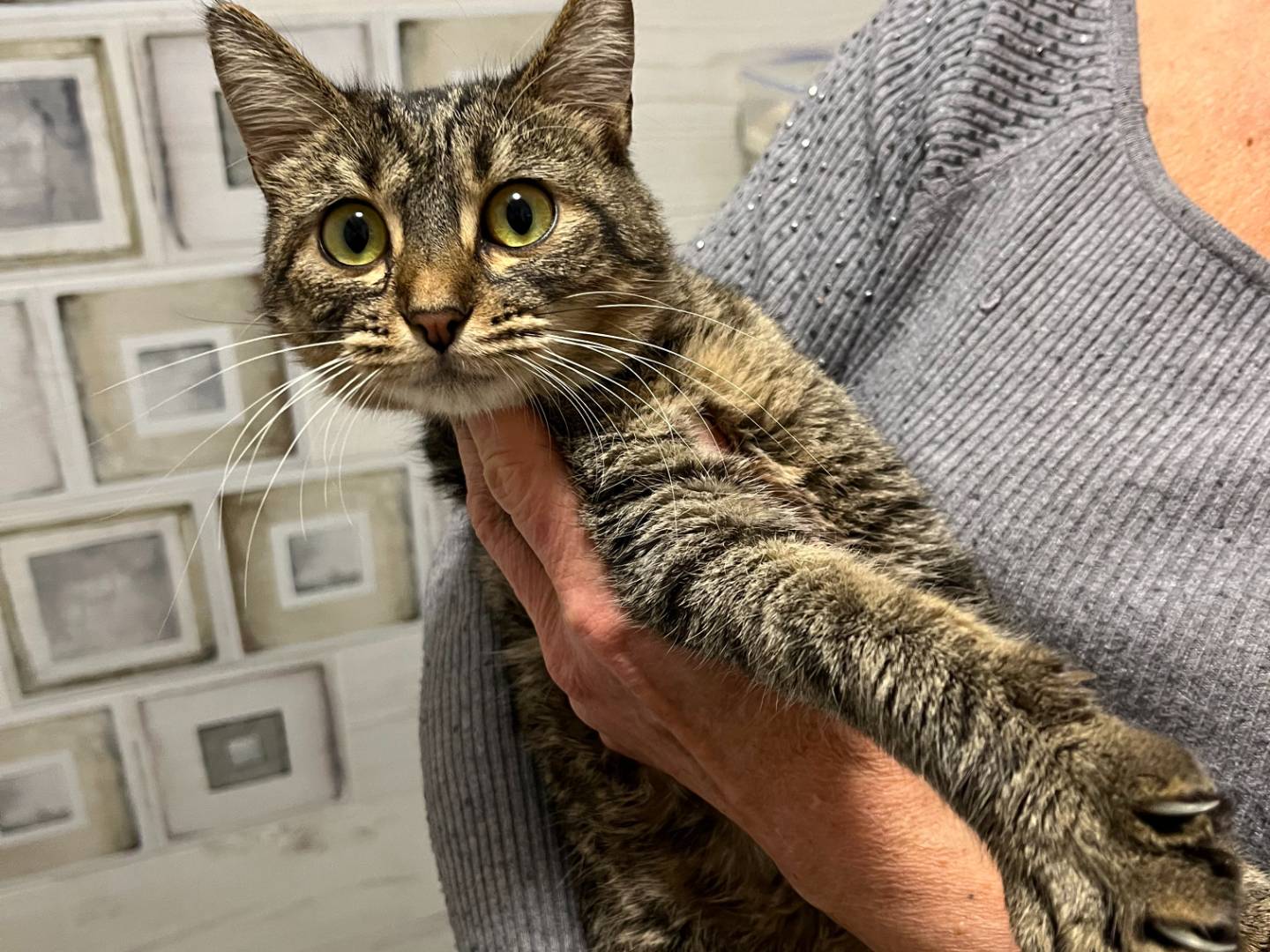 Ero una micetta sicuramente di casa perchè al mio ritrovamento (dopo un investimento che mi ha fatto perdere i cuccioli che aspettavo) avevo un collarino con l'odiato campanellino. Dopo la convalescenza presso un volontario sono stata accolta da Paola per potermi dare una possibilità in più di essere adottata, cosa molto difficile nella mia terra, la Sicilia. Sono una gattina molto vivace ma molto, molto, affettuosa che si adatta immediatamente al nuovo contesto. Dopo 25 ore di viaggio mi sono prodigata in fusa e coccole. Vorrei tanto giocare con qualcuno, oltre ai vari giochi che ho, ma la mia attuale coinquilina, una gatta anche lei in attesa di adozione, è invece riservata e non gradisce le mie scorribande. Spero di trovare presto una casetta tutta per me. L'associazione chiede un contributo per tutte le terapie sanitarie effettuate su di me (nella descrizione iniziale).